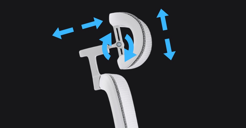 Zagłówek wyposażony w mechanizmy zmiany wysokości, wysięgu oraz kąta zapewnia wygodne wsparcie dla karku i głowy. Umożliwia skuteczne odciążenie górnego odcinka kręgosłupa zarówno podczas pracy, jak i w momentach przerwy. System regulacji pozwala na optymalne ustawienie dla pozycji siedzącej i półleżącej.