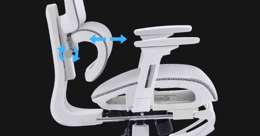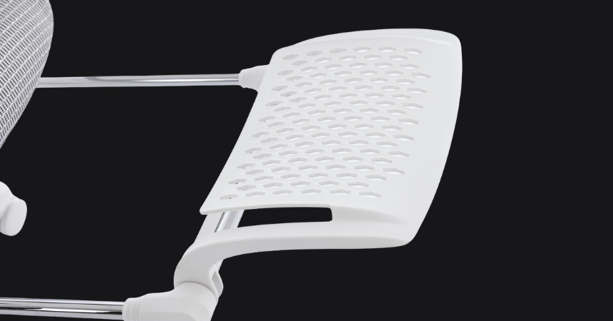 Podłokietniki z możliwością regulacji w trzech płaszczyznach umożliwiają dokładne dostosowanie podparcia dla ramion i łokci. Wspierają redukcję napięcia mięśniowego w obrębie barków i nadgarstków podczas obsługi klawiatury i myszy. Regulacja wspomaga zachowanie ergonomicznie prawidłowej postawy.
