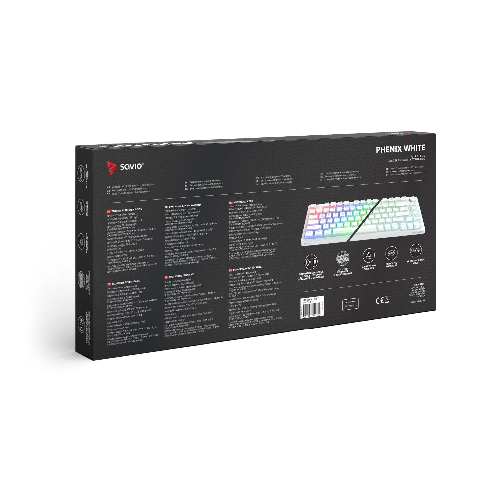 Phenix White zapewnia trzy opcje łączności: bezprzewodową 2.4 GHz, Bluetooth oraz przewodową przez USB. Użytkownicy ceniący sobie ograniczenie ilości kabli i swobodę ruchu mogą skorzystać z połączenia radiowego lub Bluetooth. Osoby preferujące stabilność i brak opóźnień mogą podłączyć klawiaturę bezpośrednio za pomocą kabla USB.
